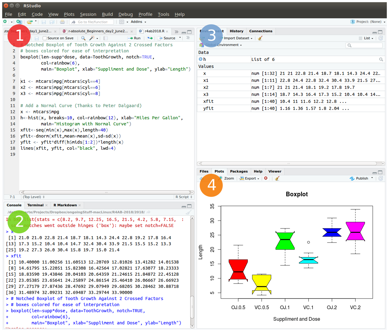 - Files / Plots / Packages / Help - a multi-purpose panel for browsing files, viewing plots, managing packages, and reading documentation.