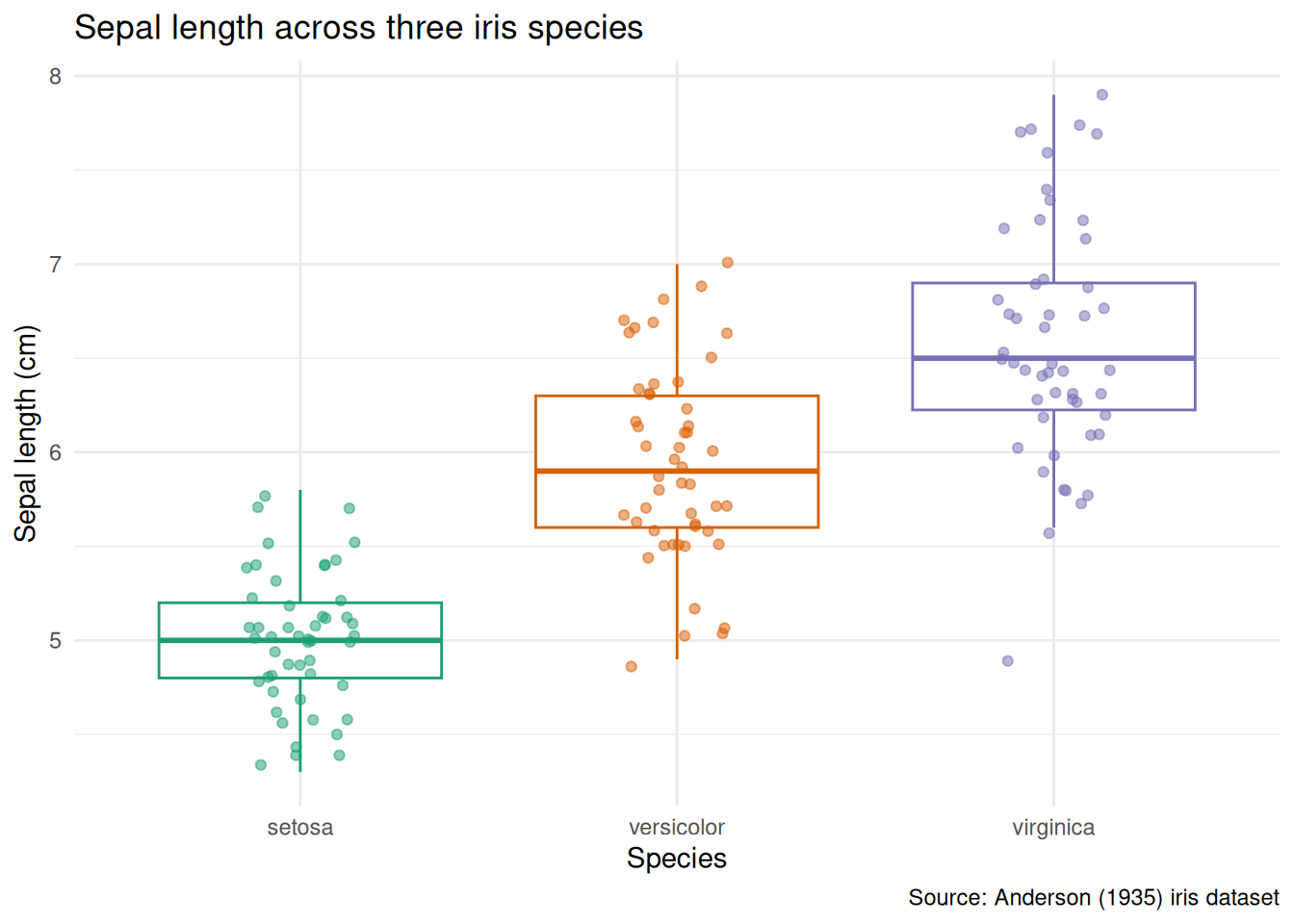 cm). A reader should never have to guess. geom_jitteroverlays individual observations - essential when group sizes are small, and informative even when they are not.outlier.shape = NAavoids plotting outlier points twice (once from the boxplot, once from the jitter).scale_colour_brewer(palette = "Dark2")replaces the default palette with a colourblind-friendly alternative.theme_minimal()removes the grey panel background.- The title says what the plot compares, not how it was made.