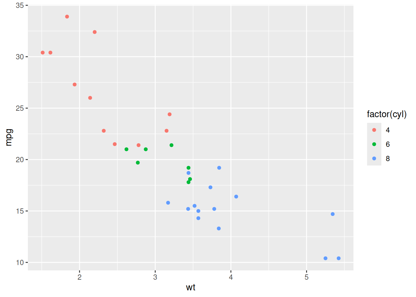 ggplot(mtcars, aes(x = wt, y = mpg, colour = cyl)) +