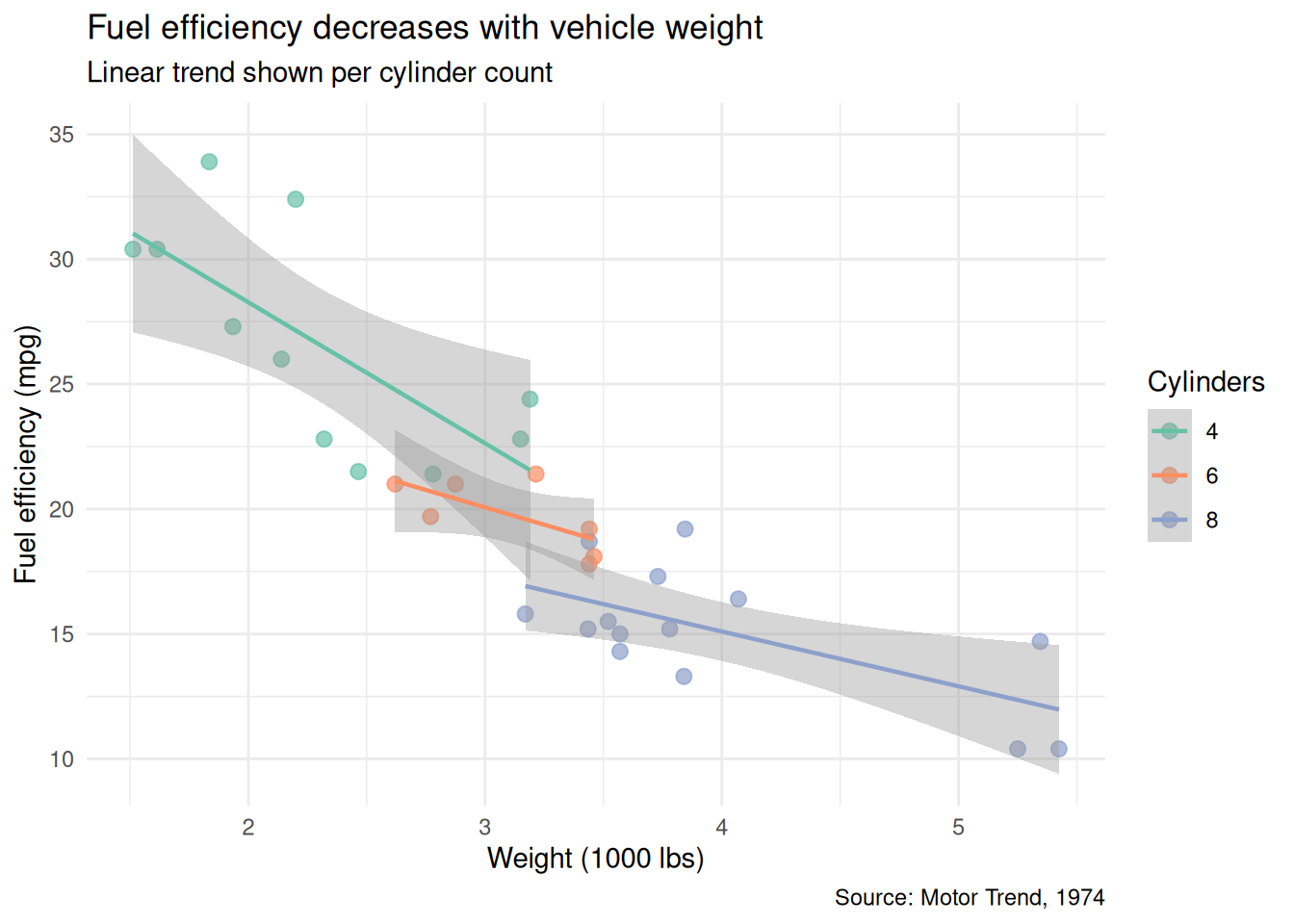 cylis explicitly converted to a factor with ordered levels, so the legend follows a logical sequence (4, 6, 8) rather than alphabetical.geom_smooth(method = "lm")adds per-group trend lines that make the relationship visible at a glance.- The title states the finding, not just “mpg vs weight.”