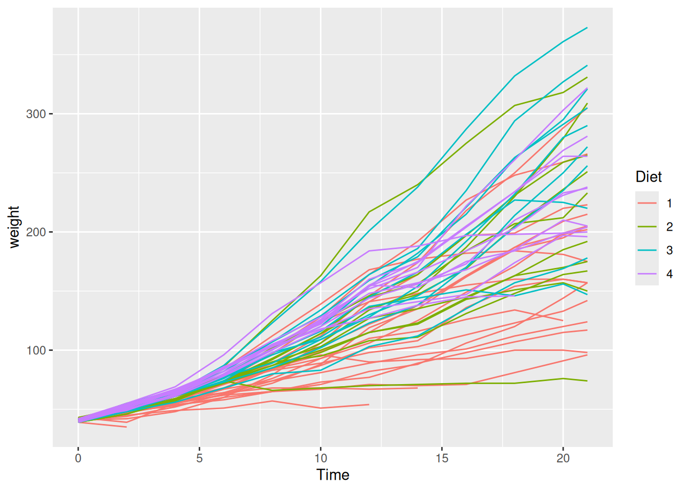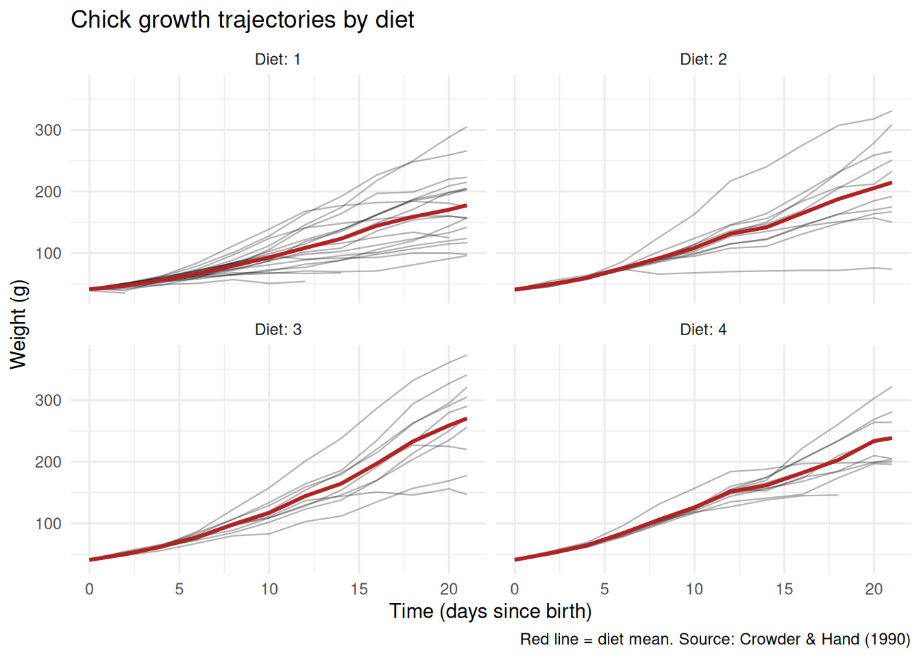 Dietseparates the spaghetti into readable panels. - Individual trajectories are drawn in light grey; the diet mean is highlighted in red. This layering lets the reader see both individual variation and the overall trend.