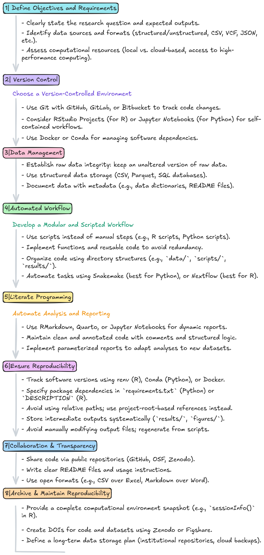 Setting up a system for reproducible data analysis requires careful planning and adherence to best practices. Bellow is an overview of the major steps a researcher should take into consideration.